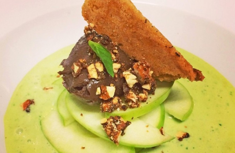 Manzana acida con cremoso de chocolate y lima con sopa de cilantro