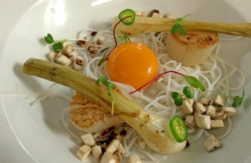 Por ultimo emplatamos con la yema, los fideos previamente hidratados,los tirabeques, las cebolletas, nuez, unas láminas de shitake, terminamos con unas gotas de lima, cilantro y el verde de la cebolleta.